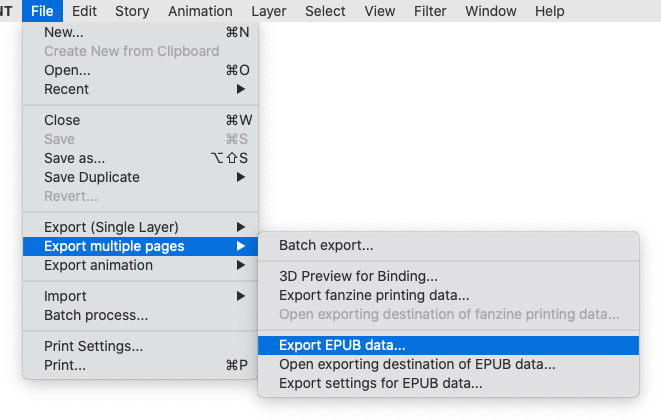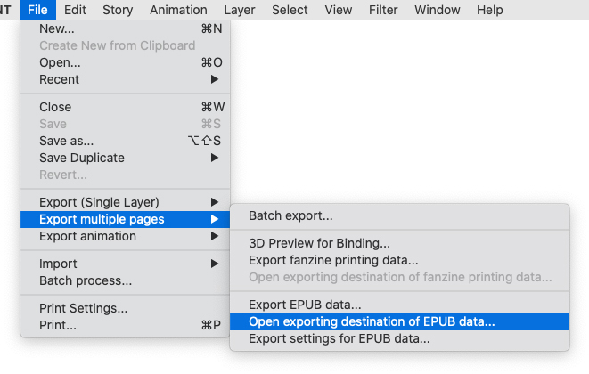 Exportar en versión EPUB es sencillo, iremos al menú [File] – [Export multiple pages] – [Export EPUB data…].