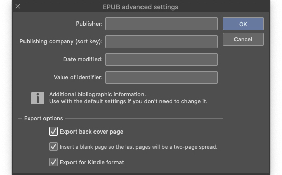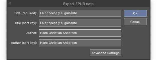 Ahora podemos simplemente hacer clic en OK y seguidamente nuestro EPUB se exportará. Si queremos añadir información como el nombre de la editorial que está publicando el libro, en la ventana anterior haremos clic en [Advanced Settings] y añadiremos los datos necesarios en la ventana que se muestra a continuación.