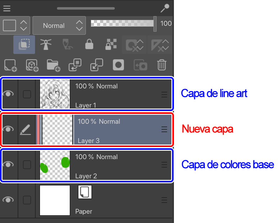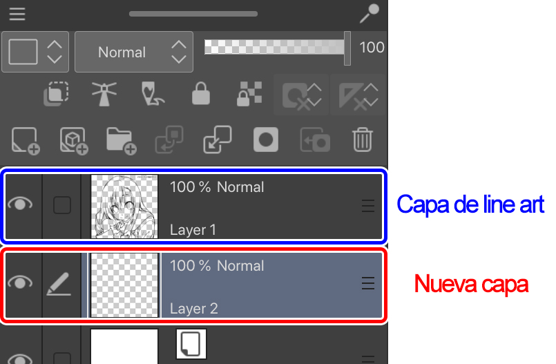 Así que creamos una nueva capa que servirá como base y la colocamos bajo la del line art.