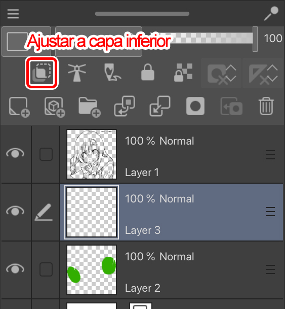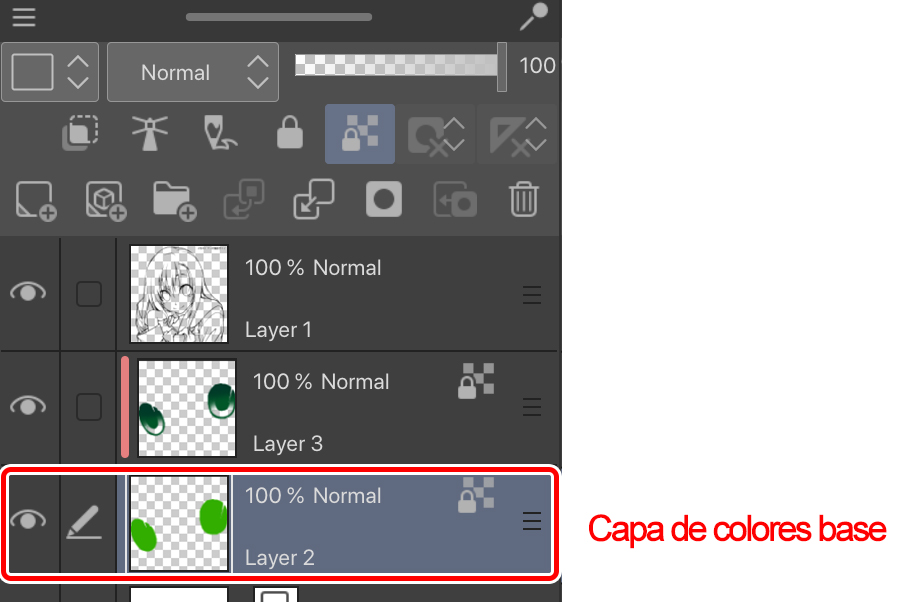 Esto anclará la nueva capa a la capa base, limitando el área que se puede pintar a los píxeles existentes en la capa base.