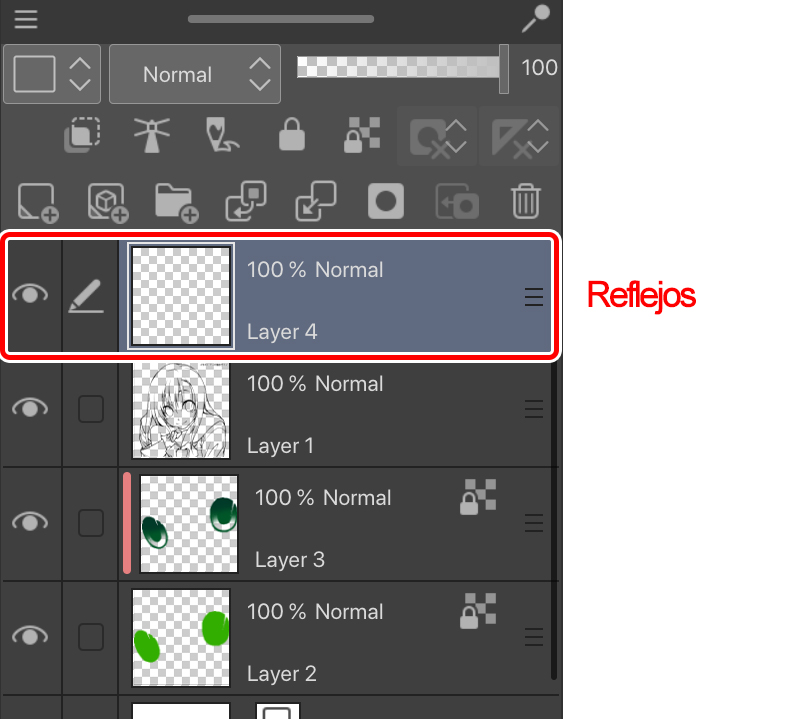 Para pintar los reflejos, crea una nueva capa sobre la del line art. Dibujando los reflejos encima del line art conseguimos dar más profundidad a los ojos.