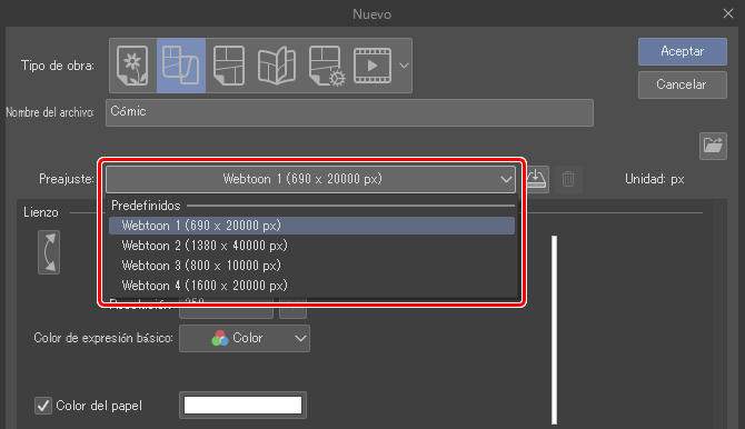 Por fortuna, en Clip Studio Paint hay preajustes específicos para el formato webtoon.