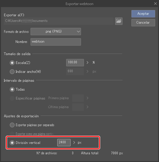 Para ello, Clip Studio Paint te permite ajustar el número de secciones y su tamaño al exportar tu webtoon. Siempre puedes cambiar estos ajustes desde el menú Archivo > Exportar webtoon.