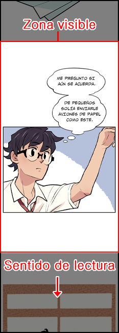 En los webtoon, en cambio, no hay necesidad de pensar las escenas según el mismo criterio, ya que no hay cambios de página, pero sí debes tener en cuenta el ritmo al cual el lector desliza la pantalla para aprovechar el espacio vertical de forma más dramática.