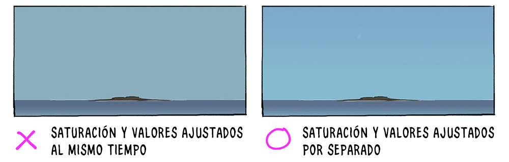 Rellena el cielo con una tonalidad neutra de azul y luego el mar. Después, añade dos degradados: uno más oscuro en la parte superior y uno más claro en la inferior. ¡No te olvides de cambiar el tono! En uno de mis tutoriales anteriores hablamos de las paletas de colores. Te ayudará a entender mejor lo importante que es cambiar el tono entre los colores.