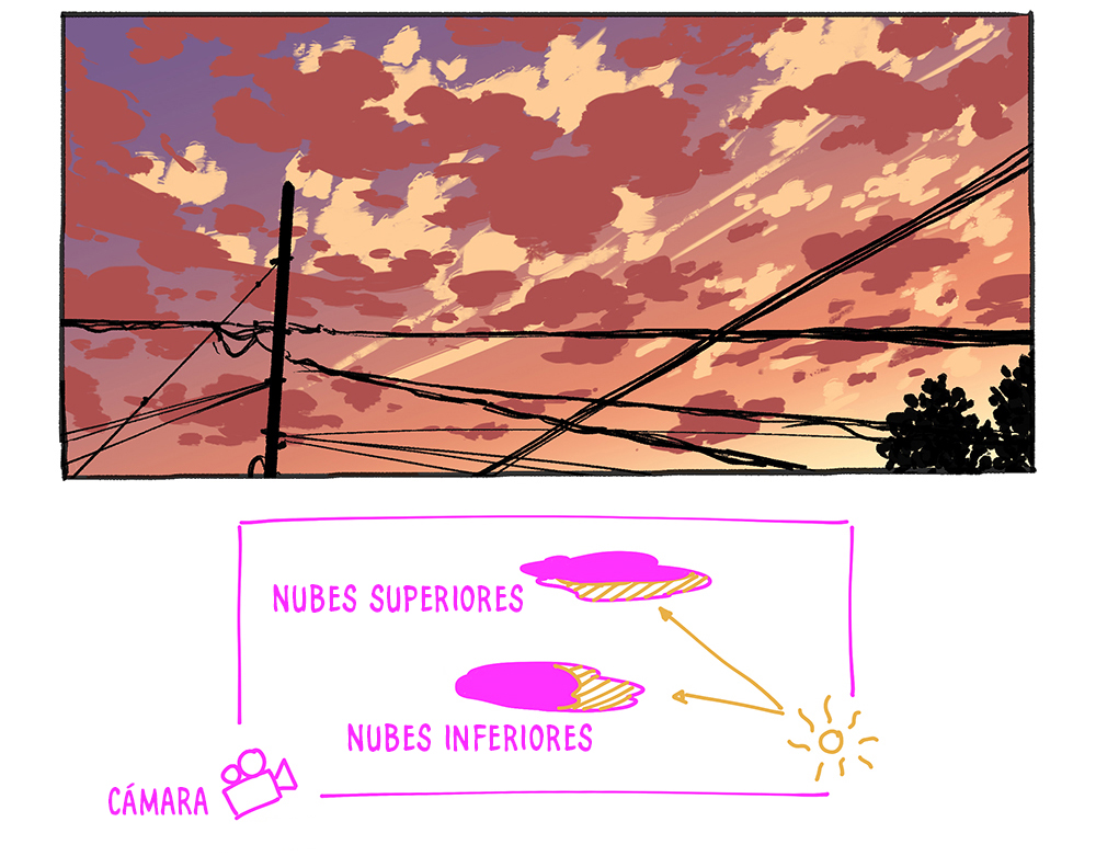 ¡Utiliza referencias! ¡Siempre! No dibujes confiando únicamente en tu memoria. La apariencia del cielo cambia en función del clima, de la altitud, de la posición del sol y la luna y hasta de la ubicación en la que ocurre la escena. ¡Este tutorial apenas abarca unos cuantos ejemplos típicos!