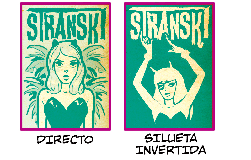 El retrato directo y la silueta invertida comparten una composición similar en la forma del personaje: medio cuerpo y mirada hacia delante. El retrato de frente directo presenta un elemento en el fondo que se extiende detrás del personaje. La manifestación inmediata de las emociones del personaje hacen de esta composición una muy eficaz. El impacto visual de la silueta invertida también es considerable, pero en lugar de provenir del personaje o de los elementos del fondo, nace del alto contraste del fondo que guía la mirada hacia el personaje central.
