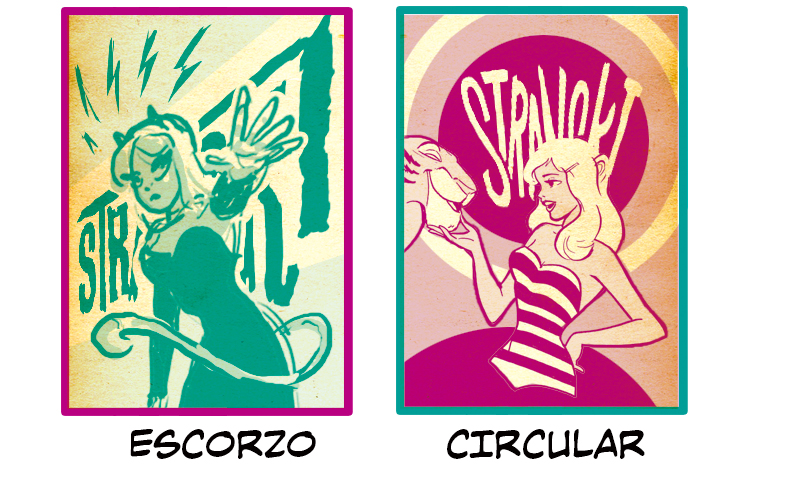 Escorzo y Circular también comparten una composición similar en la forma del personaje: caderas y medio cuerpo hasta las caderas inclinado hacia un ángulo. Los títulos de ambas composiciones se integran en la composición de cada portada y se adaptan a las formas y los elementos que los rodean. En escorzo, el título sigue la línea de acción del brazo extendido del personaje. Tanto la cola en primer plano como los rayos de arriba sirven para equilibrar el espacio negativo superior e inferior de la combinación del personaje y el título. En circular, los personajes y el título se complementan en términos de contraste y diseño. La cabeza del personaje oculta parte del título, lo que une ambos elementos juntos de cara al espectador.