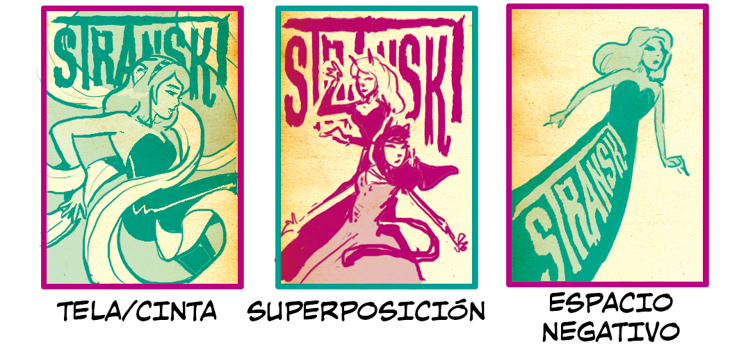 Tela/Cinta, como su nombre indica, consiste en añadir una tela y hacerla fluir a lo largo de la imagen para guiar la mirada del lector desde el título hasta la figura. La curva de la cinta no tiene por qué seguir el mismo recorrido que en el ejemplo, lo único importante es que guíe al espectador a través del título y la figura. Además, este ejemplo tiene solo en cuenta la audiencia que lee desde la esquina superior izquierda hasta la esquina inferior derecha, como la gente de habla hispana o de habla inglesa. Si la demografía a la que va orientada tu obra tiene un patrón de lectura distinto, deberás ajustar la cinta para adaptarla y conservar el mismo dinamismo. La idea de la composición Superposición es similar a la de Tela/Cinta, aunque con varios personajes. Si te imaginas que una cinta recorre la imagen de Superposición, verás que se consigue un resultado similar. Al igual que con Tela/Cinta, adecúa la composición al orden de lectura de tu público objetivo.