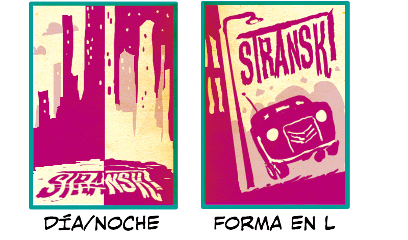 Estas tres portadas no tienen figuras, por lo que usan su composición única para contar su historia. Día/Noche y Forma en L son las composiciones que más cuentan con una sola imagen. Día/Noche recuerda a Reflejo y juega con el contraste para hablar sobre lo mucho que cambia la ciudad cuando el día se convierte en noche. El título también se adapta a la composición. Forma en L simula movimiento de cámara con un ángulo en forma de L. La elección del coche es muy acertada y parece hacer referencia a una persecución al volante que sucede en la historia o a una situación de emergencia que obliga a un personaje a ir hasta cierto punto. Si intentas imitar esta composición, ten en cuenta que el elemento central no tiene por qué ser un coche.