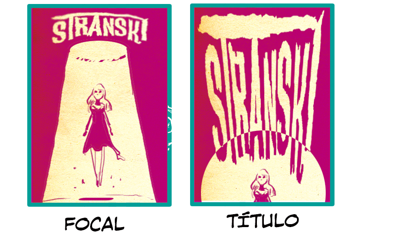 He juntado Focal y Título porque, si bien Focal se centra en el personaje y Título en el objeto, ambas composiciones usan dos colores contrastantes y muestran la misma escena, aunque desde distintas perspectivas. En Focal, la figura es la protagonista de la portada y el título flota sobre ella. En Título, observamos el personaje desde arriba y 4/5 partes de la portada están ocupadas por el título, el cual está cuidadosamente estirado para ajustarse al foco que apunta a la figura de abajo.