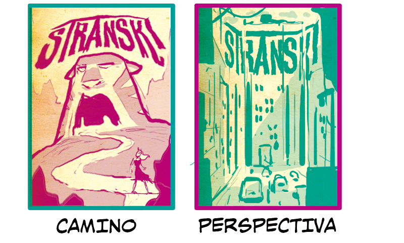 Camino y Perspectiva son cubiertas centradas en el escenario. Camino usa la conocida composición con un camino largo y sinuoso que lleva al personaje hacia una estructura que se muestra en la distancia. Se puede utilizar de forma metafórica, pero también es una composición ideal en caso de que el protagonista esté en el tramo final de su viaje, ya que la estructura del fondo podría simbolizar al antagonista o el destino final. Observa cómo la estructura ocupa casi la mitad de la página y se encuentra justo arriba del centro. Si empezamos por la figura y vamos moviendo nuestra mirada hacia arriba siguiendo el camino, nos topamos con la estructura y el logotipo o título encima.