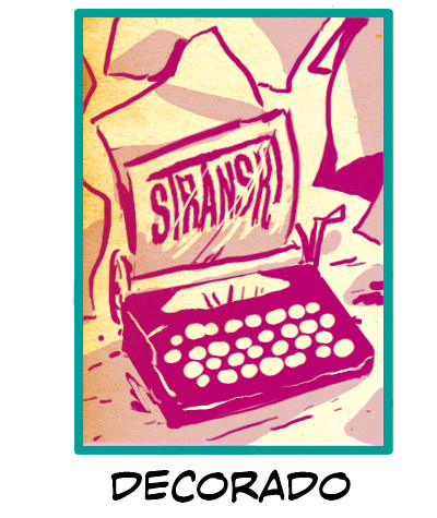 Decorado es un tipo de composición única que, como Patrón y Simetría, puede dar variedad a las portadas de tus cómics. En nuestro caso, el decorado es una máquina de escribir con el título integrado en la página. El decorado y el título están tanto de frente como centrados en esta composición de fondo relativamente simple. Es mejor que el decorado que elijas sea un elemento de importancia constante en la trama para dar consistencia al conjunto.