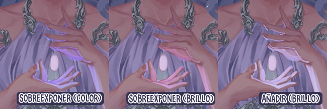 Siéntete libre de experimentar con varios modos de combinación, como Añadir o Sobreexponer, aunque creo que Añadir (brillo) es el modo que mejor funciona en nuestra imagen. Aquí tienes unos cuantos ejemplos de los distintos modos de combinación aplicados a las manos. Como puedes ver, todos ellos, de un modo u otro, dan ese efecto de resplandor que buscamos.