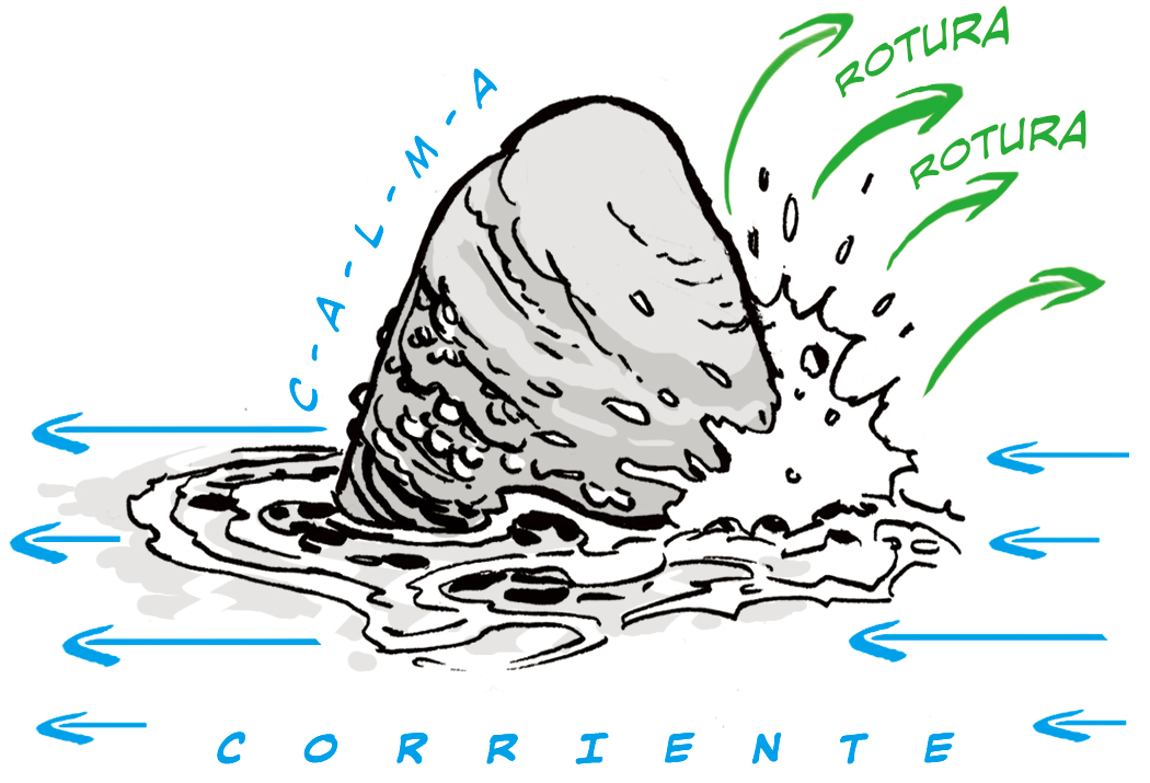 Para indicar la corriente del agua cuando está en calma, puedes aprovechar los lados de los elementos sólidos contra los que el agua impacta.