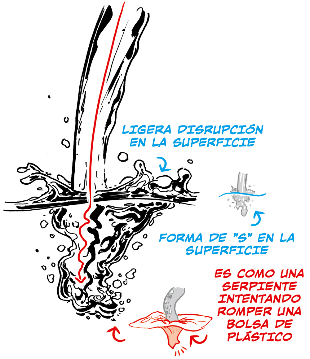 Tras el impacto inicial, el agua que hay bajo la superficie se transforma en burbujas.
