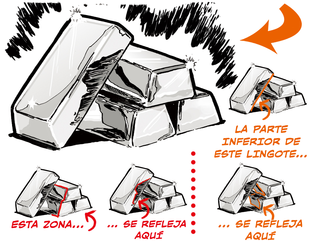 Al dibujar muchos lingotes juntos, simplificamos los reflejos, pero reflejamos las sombras oscuras.