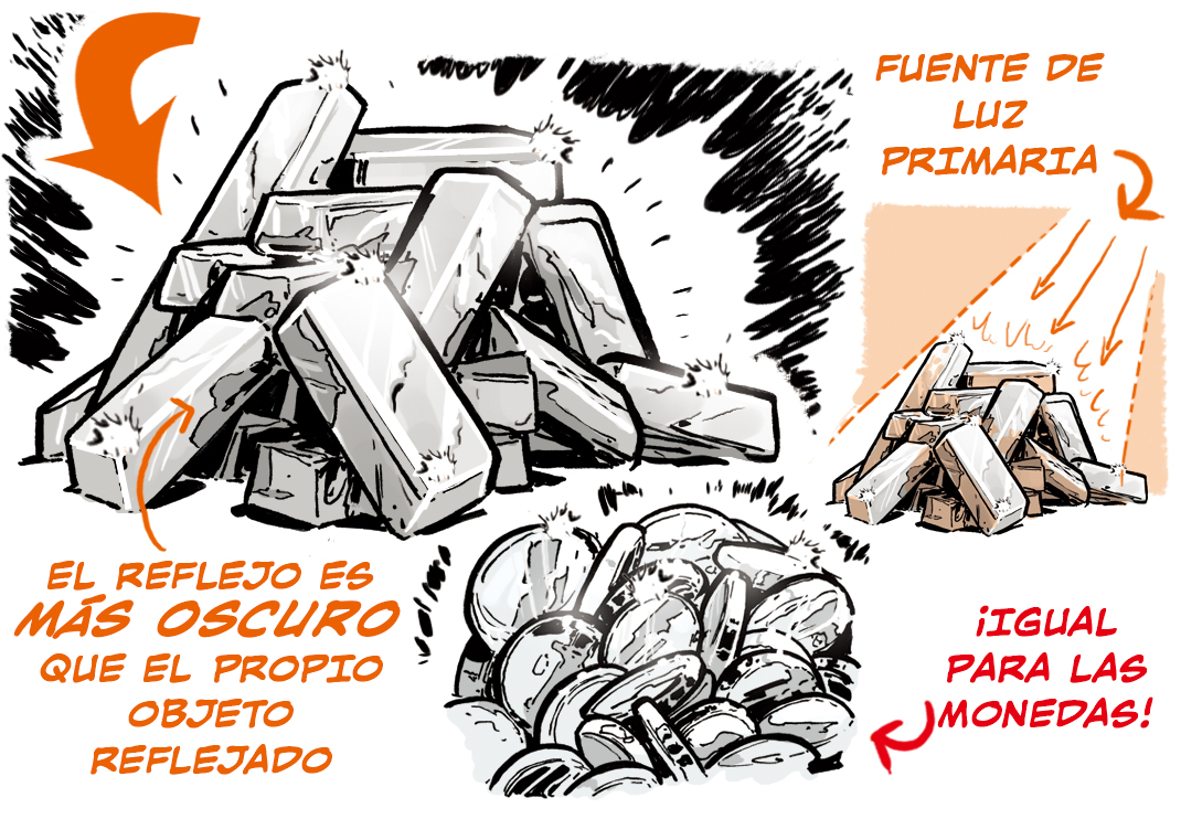 Al dibujar lingotes de oro, ten en cuenta cómo se reflejan entre sí.