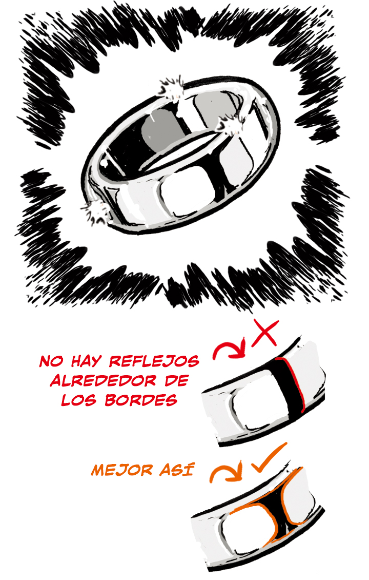 Al dibujar el oro en formas más complejas, recuerda que las luces y los reflejos se alargan en los bordes curvos.