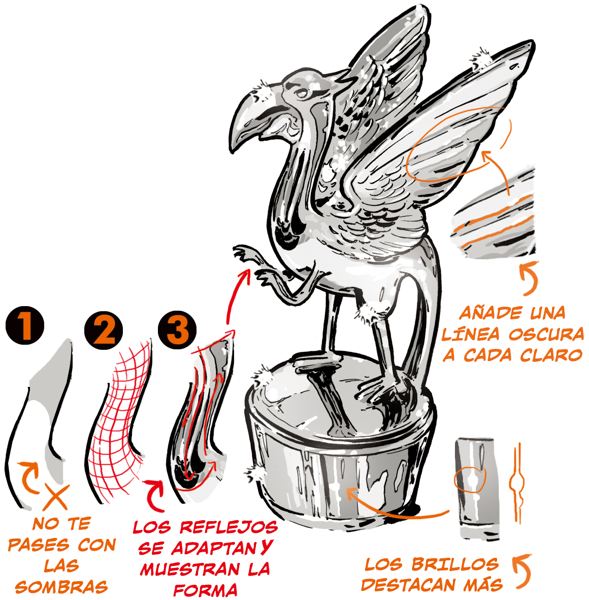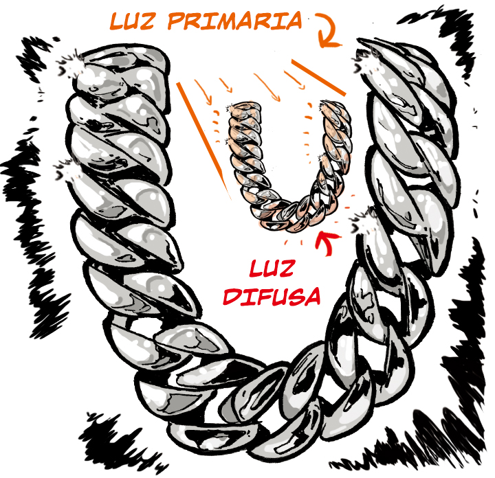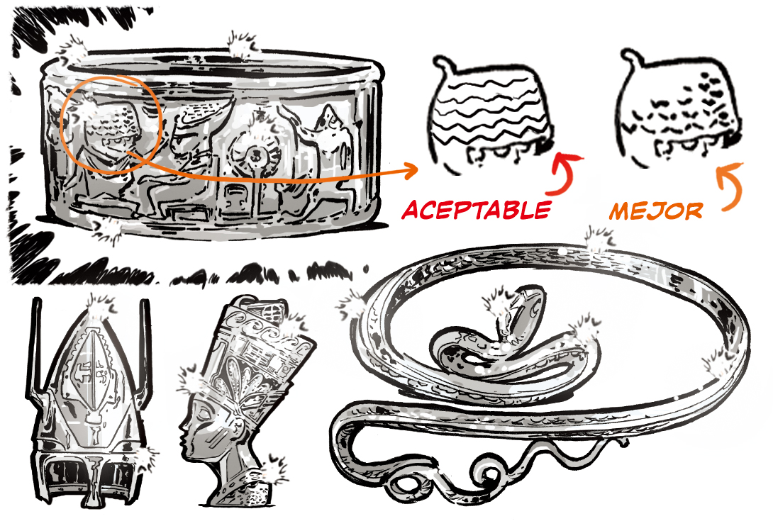 Las sombras, que ayudan a describir la forma, tienden a perderse en el oro debido a la alta reflectancia. Para contrarrestar esta propiedad, podemos definir las formas usando los reflejos de las curvas convexas como contornos cruzados.