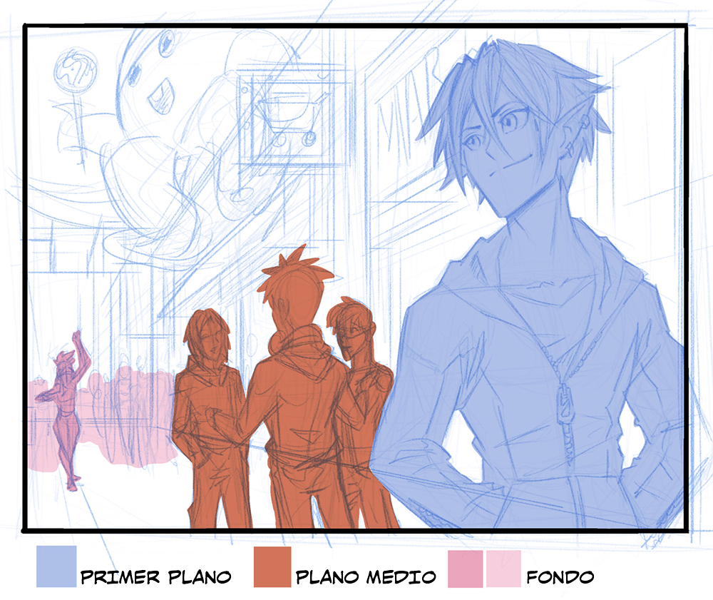 Después, entintamos nuestros personajes y los objetos que tenemos en primer plano. Dado que el primer plano es el más cercano al lector, nos interesa que los contornos sean más gruesos y llamativos. La vista trata de forma inconsciente los elementos con contornos más gruesos como los más cercanos, y los de líneas más finas como los lejanos.