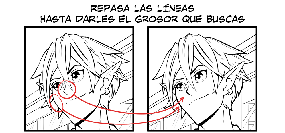Revisa la imagen en general y ajusta el grosor de las líneas. Yo a veces voy cambiando entre distintos elementos y se me olvida dar grosor a alguna línea. En este caso, he aumentado el grosor de las líneas del personaje principal en primer plano para que resalte un poco más y separarlo más claramente del resto de elementos.
