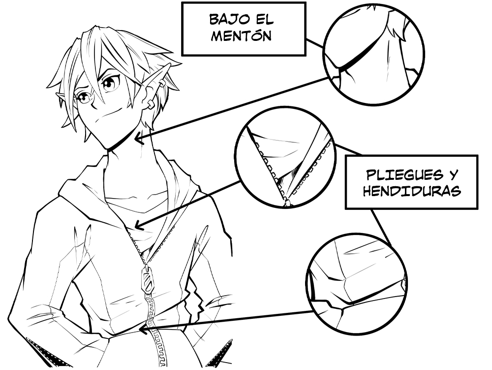 Da más grosor a las líneas que muestran pliegues, arrugas, hendiduras o incluso a las de la barbilla para darles más profundidad y tridimensionalidad, ya que suelen ser áreas que reciben poca o nada de luz.