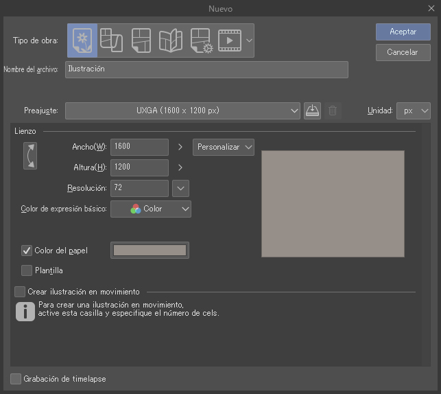 Al crear un nuevo lienzo, podemos configurar el color del papel predeterminado. En mi caso, he seleccionado un gris cálido neutro.