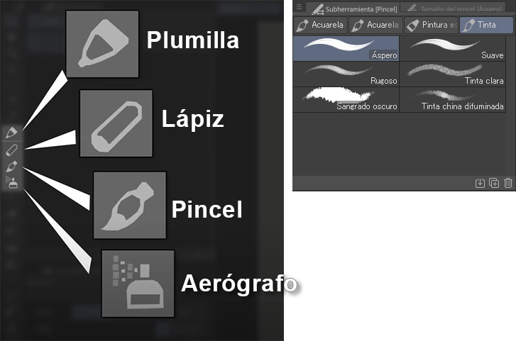 A la hora de pintar, utilizo principalmente las cuatro herramientas de la imagen. Al seleccionar una de ellas, se abre el menú de subherramientas para elegir el pincel ideal para cada situación.