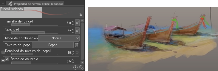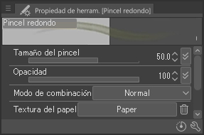 Estas subherramientas se pueden ajustar de forma individual desde la paleta de propiedades que se muestra en la imagen de abajo. Desde aquí podemos modificar el tamaño, la opacidad, el modo de combinación o la textura, entre muchas otras opciones. ¡Y lo mejor es que cada pincel tiene su propia configuración personalizable! Suelo jugar mucho con todos estos ajustes de CLIP STUDIO PAINT.