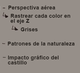 Me gusta la perspectiva aérea, especialmente el desafío de rastrear cada color a través de la profundidad. Parece que los grises van a reinar en este ejercicio, ya que están por casi todo el fondo de la foto. También quiero estudiar los patrones que crea la naturaleza, una materia que me cuesta bastante. Me gusta mucho el impacto gráfico que genera el castillo de base. Es una característica esencial que quiero conservar en mi pintura.
