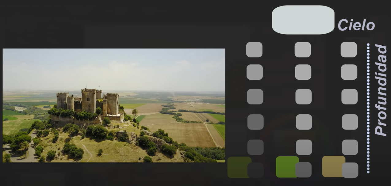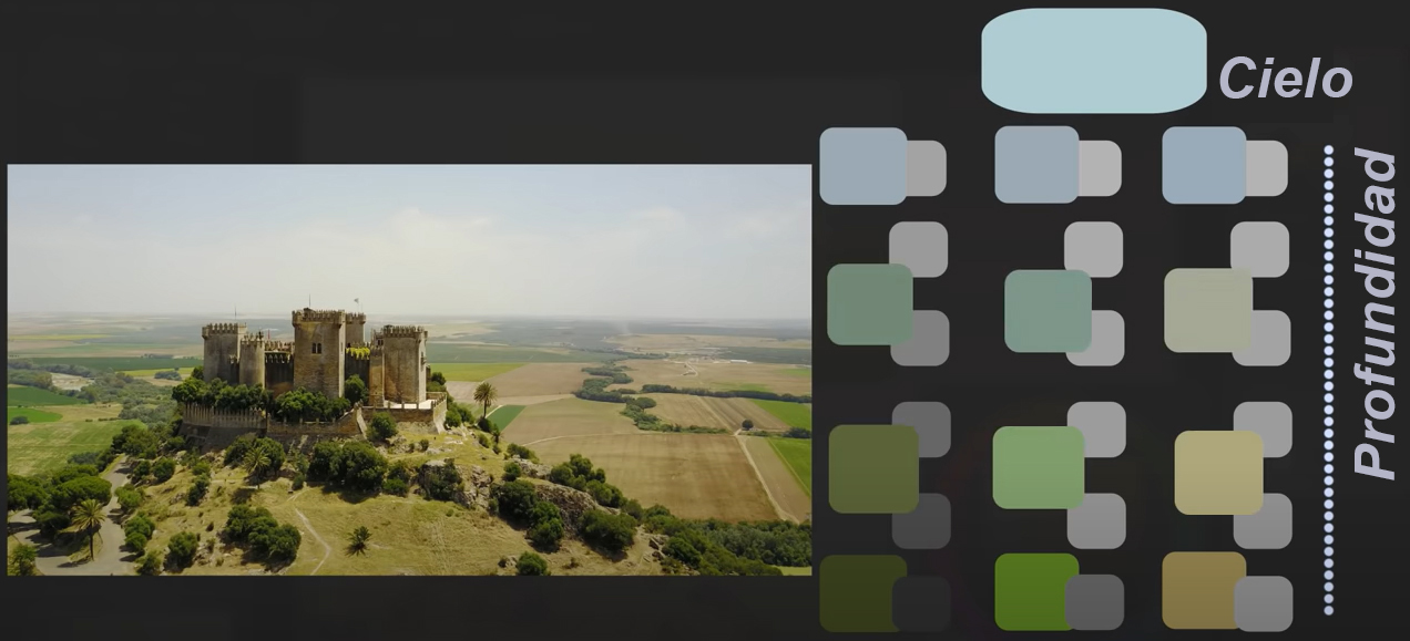 Estos son los colores que más vemos en los elementos cercanos a la cámara. Lo siguiente es fijarnos en cómo van cambiando a medida que se alejan. Todos estos elementos son más oscuros que el cielo, algo que debemos respetar en nuestra pintura. Los valores se van aclarando con la distancia, pero nunca dejan de ser más oscuros que el cielo.