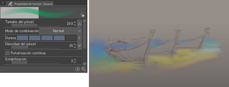 Estoy usando principalmente el pincel fino y el pincel redondo de CLIP STUDIO PAINT. Estos dos pinceles interactúan muy bien con los colores que hay en el lienzo, algo muy importante al pintar una imagen en perspectiva aérea, ya que, por lo general, tendrás que hacer numerosos ajustes menores.