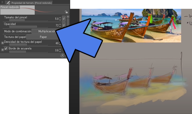Cambiamos el modo de combinación del pincel de multiplicación a normal para conseguir unos trazos más opacos. Así es como suelo dibujar elementos como las cintas, parte de las luces, los patrones cáusticos del agua y algunos reflejos de las barcas y las olas.
