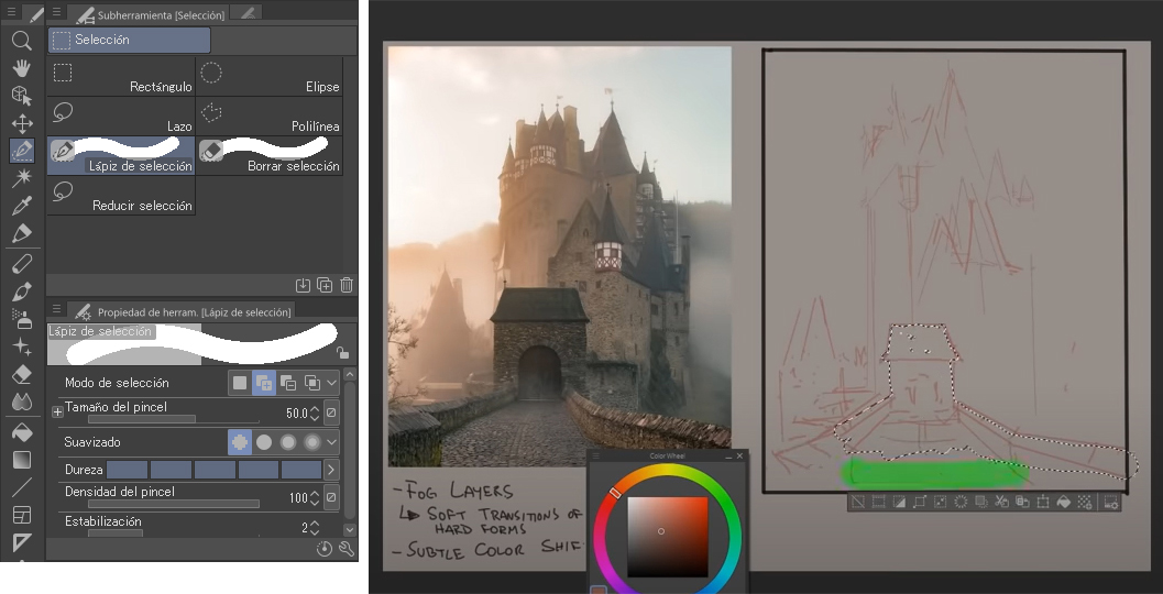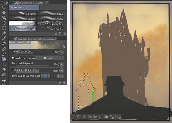 Tras configurar el pincel de pastel con una textura de papel que imite los ladrillos del castillo, me di cuenta de que, si aumentaba lo suficiente su tamaño, podía conseguir un efecto similar al del aerógrafo, aunque con una textura más definida en los bordes. Es una interesante combinación que, en mi caso, ha funcionado bien para los ladrillos que la niebla deja entrever.