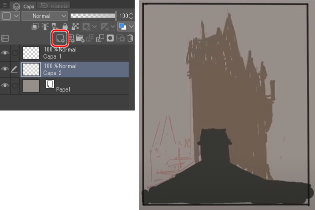 Con mi selección hecha, creo una capa nueva y la relleno con un color plano, al menos de momento. Repito el mismo proceso con la parte más grande del castillo sin preocuparme demasiado por los espacios negativos, ya que creo que darán encanto al conjunto una vez que haya terminado.