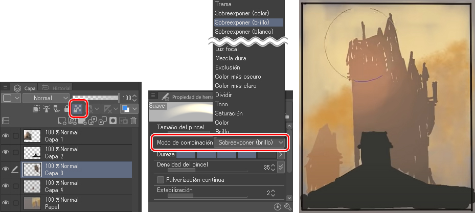 Selecciono la capa principal del castillo y activo el icono de bloquear píxeles transparentes para pintar sin miedo con mi aerógrafo grande, el cual he configurado con el modo de combinación de sobreexponer (brillo). Así la selección de mi castillo permanece intacta.
