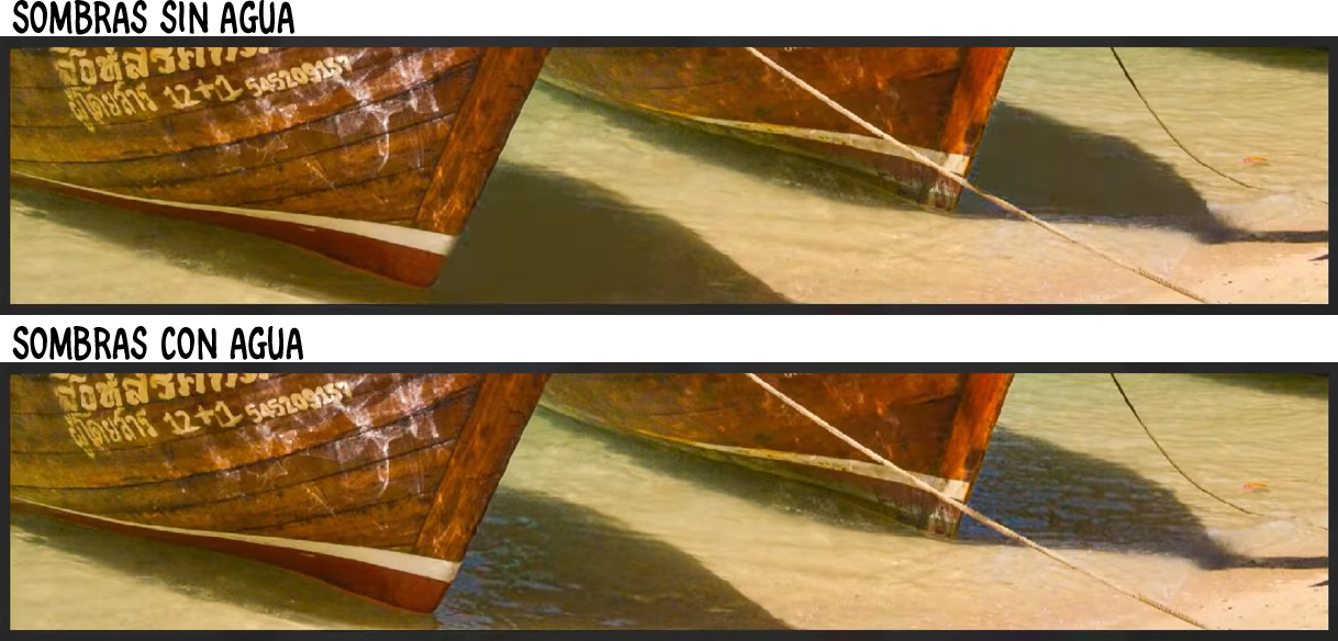 Sin embargo, debido a la reflexión del agua y a que refleja un cielo claro, los reflejos de la luz entran en conflicto con el sombreado oscuro. En nuestro caso, buscaremos unos tonos más claros mezclados con las sombras oscuras.