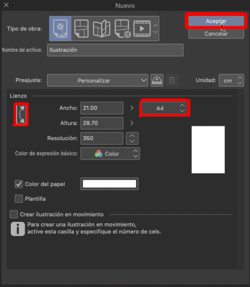 “Archivo > Nuevo > A4 vertical > Aceptar”.