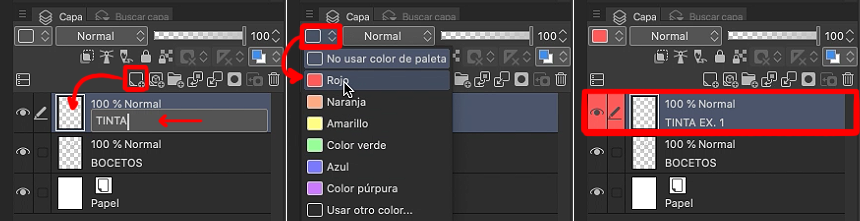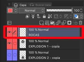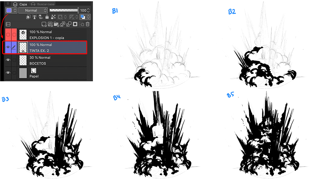 Tras realizar este breve bosquejo, creamos una nueva capa encima de la capa “Bocetos”, la renombramos como “Tinta Explosión 1” y le damos un color rojo para detectarla rápidamente en los procesos futuros.