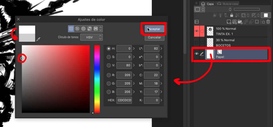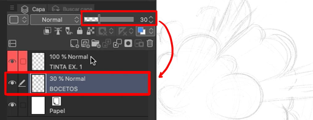 Si es necesario o hiciste mucha presión en las líneas del boceto, baja la opacidad para que no te moleste.