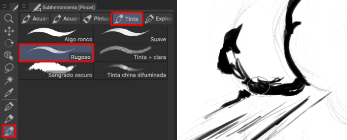 Ahora, en la capa nueva que creamos, comenzamos a trazar los volúmenes con la herramienta “Tinta > Rugoso” a un tamaño medio y en color negro.