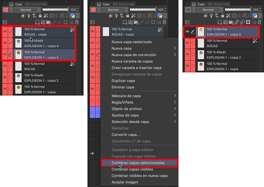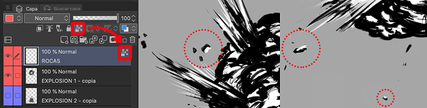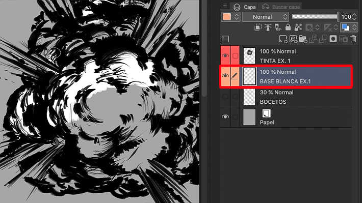 Para terminar el entintado de esta explosión, combinamos las capas de “Tinta explosión 1” y “Base blanca”. Con ambas capas seleccionadas, haz clic derecho y selecciona la opción “Combinar capas seleccionadas” en el menú emergente. En la capa resultante, retocamos detalles blancos y negros para terminar volúmenes.