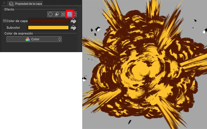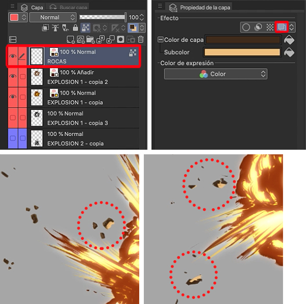 El segundo lo aplicaremos después de dar color a los escombros, a los cuales le dotaremos de color igual que a la explosión del punto 4: propiedades de capa, color principal #412B1A y subcolor #EEBD7A.