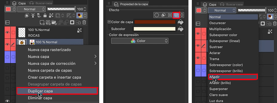 A continuación, duplicamos esa misma capa (clic derecho > Duplicar capa) y le aplicamos el color #481C08 como color principal y #FFF5DA como subcolor. Finalmente, ponemos la capa en modo de combinación “Añadir”.