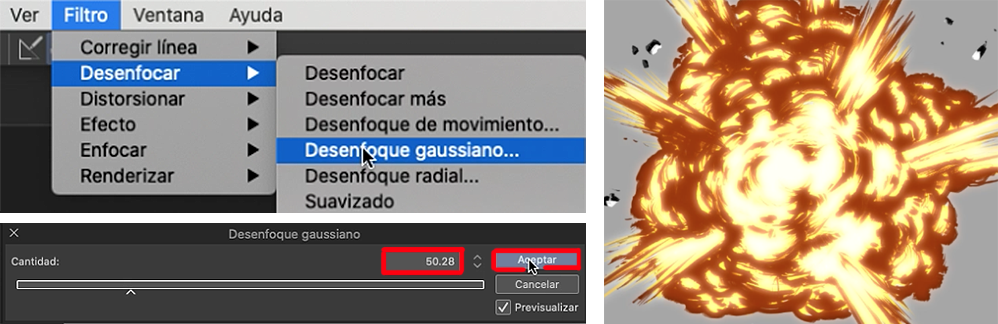 Procede a aplicar los pasos 4 (Color) y 5 (Desenfoques) a la segunda explosión.