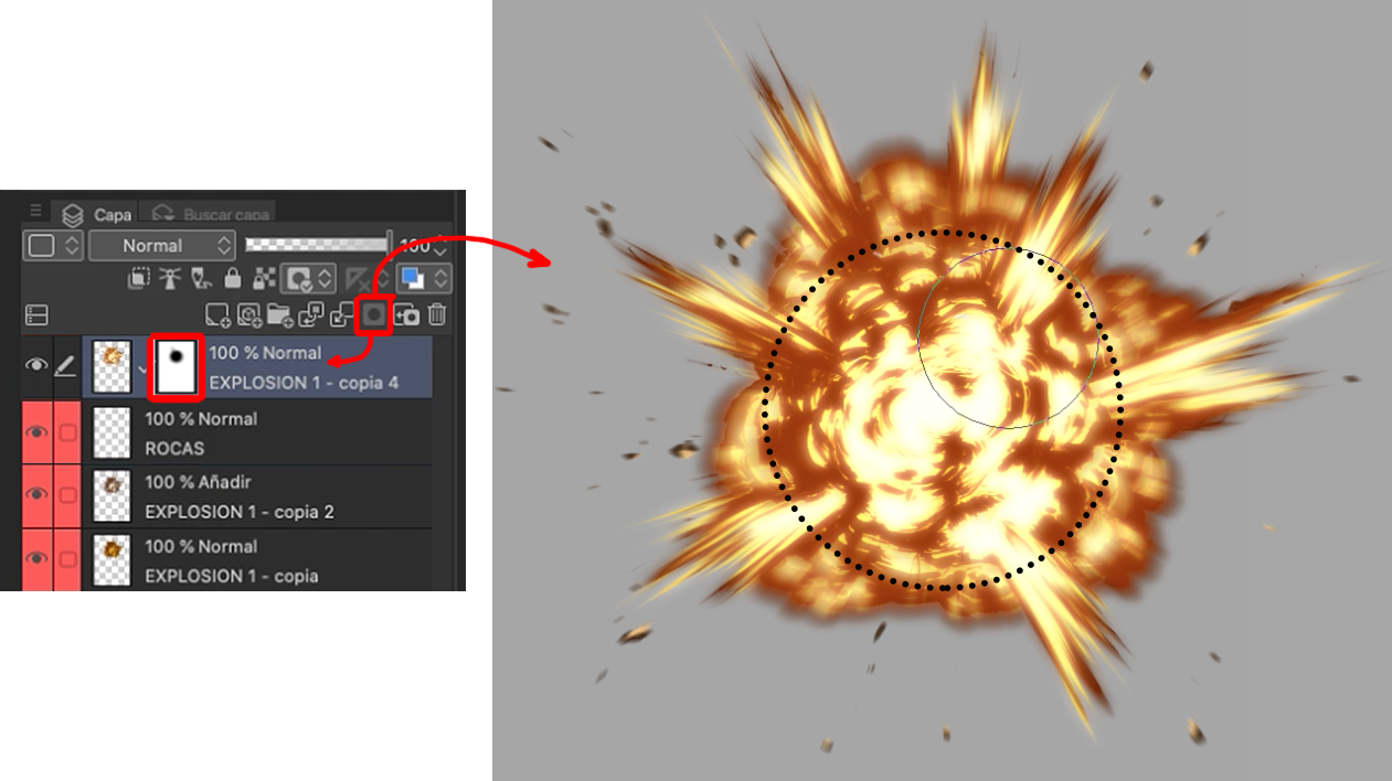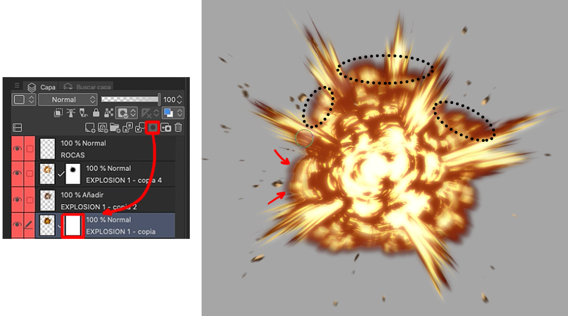 Ahora, antes de pasar al punto 4, aplicaremos algunos escombros simulando un estallido real y dándole más fuerza a la explosión. Este paso podemos hacerlo directamente en la capa de la explosión correspondiente o crear una nueva para las rocas. Aconsejo esto último. Por lo tanto, creamos una capa nueva, la renombramos y le damos otro color en la paleta de capas. Después, dibujamos rocas de diferentes tamaños alrededor del fuego. Mira esta imagen: