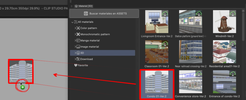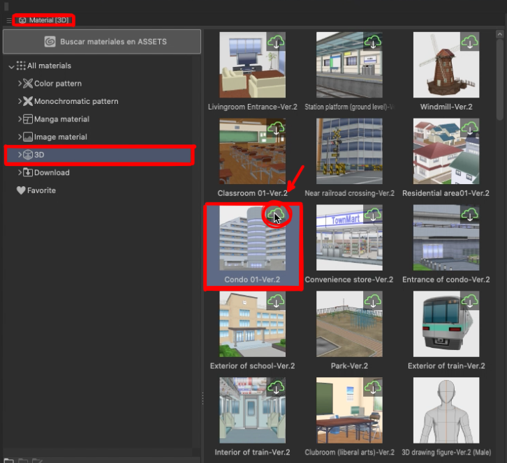 A continuación, en un documento nuevo, abriremos un material 3D de los que contiene CSP y que es posible descargar gratis. Para ello, entra en la paleta de “Material (3D)” y busca en CLIP STUDIO ASSETS el entorno que más te guste. Después, haz clic en el icono de la nube para descargarlo gratuitamente.