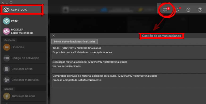 Se abrirá automáticamente la ventana de CLIP STUDIO. Al iniciar sesión, tendrás una notificación en el botón de “Gestión de comunicaciones” en la que verás que, efectivamente, se habrá descargado con éxito tu material 3D.