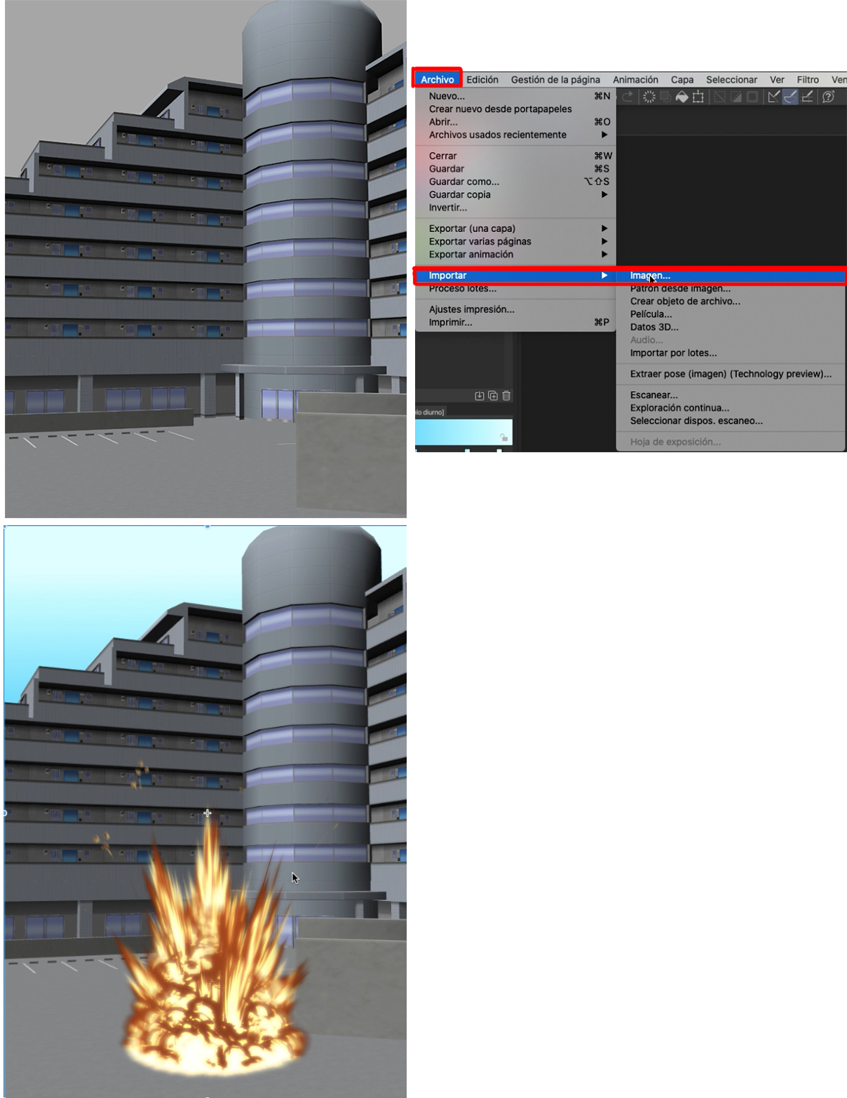 Coloca el entorno en la perspectiva que desees e importa (Archivo > Importar > Imagen) el PNG de la explosión que guardamos anteriormente.